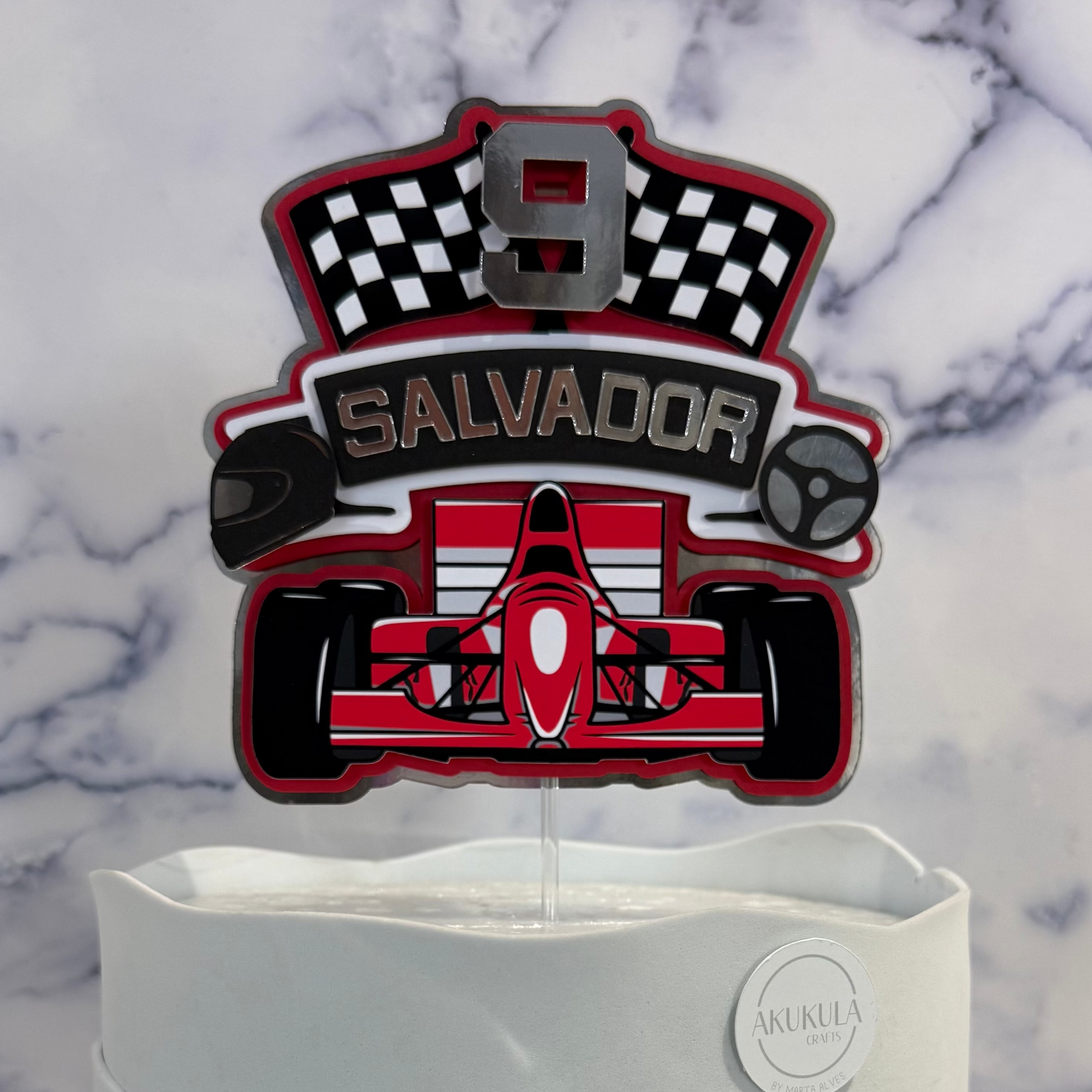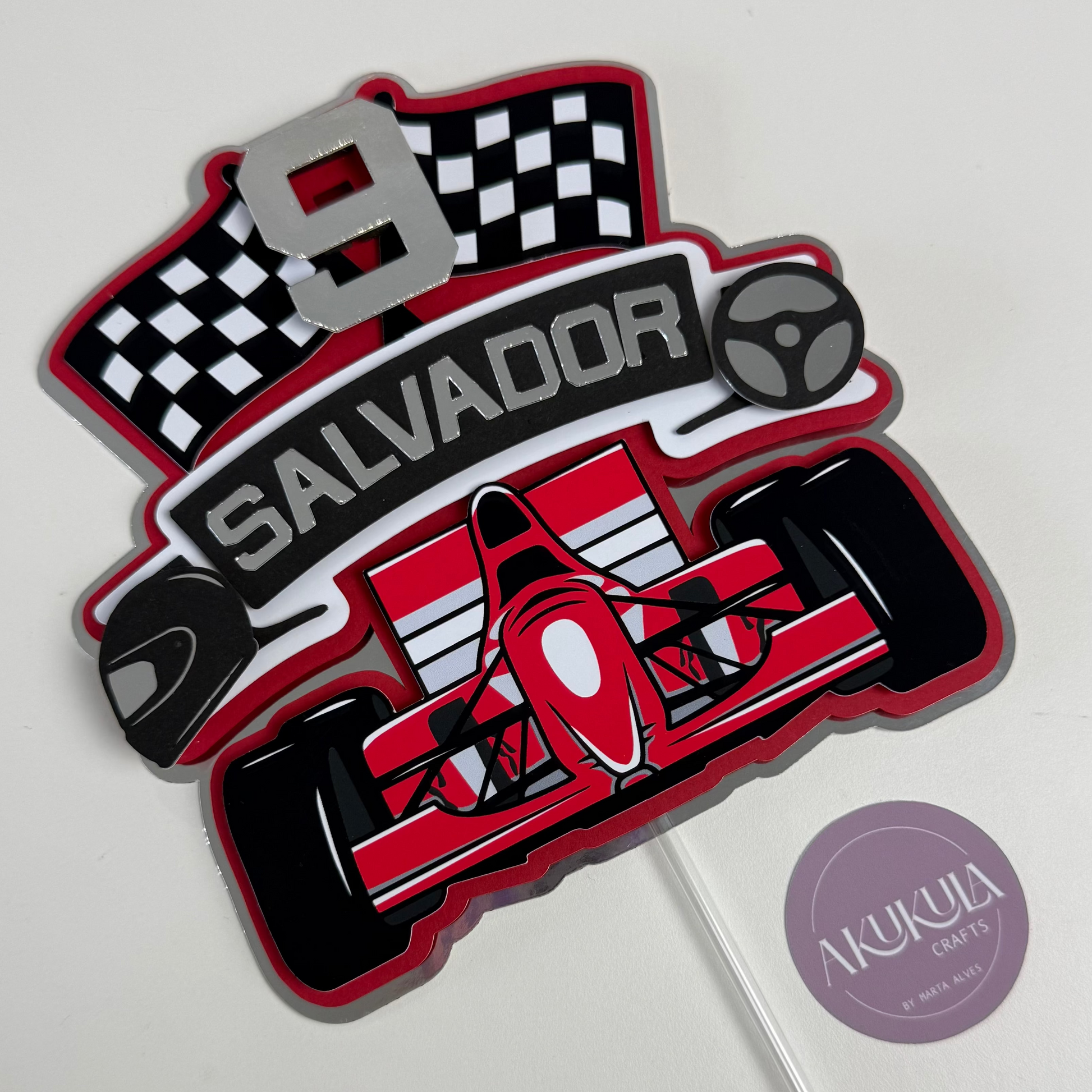 Acelera rumo a uma festa cheia de emoção com o Topo de bolo Fórmula 1, ideal para pequenos e grandes fãs de velocidade. Perfeito para dar destaque ao bolo e tornar o aniversário ainda mais especial.
