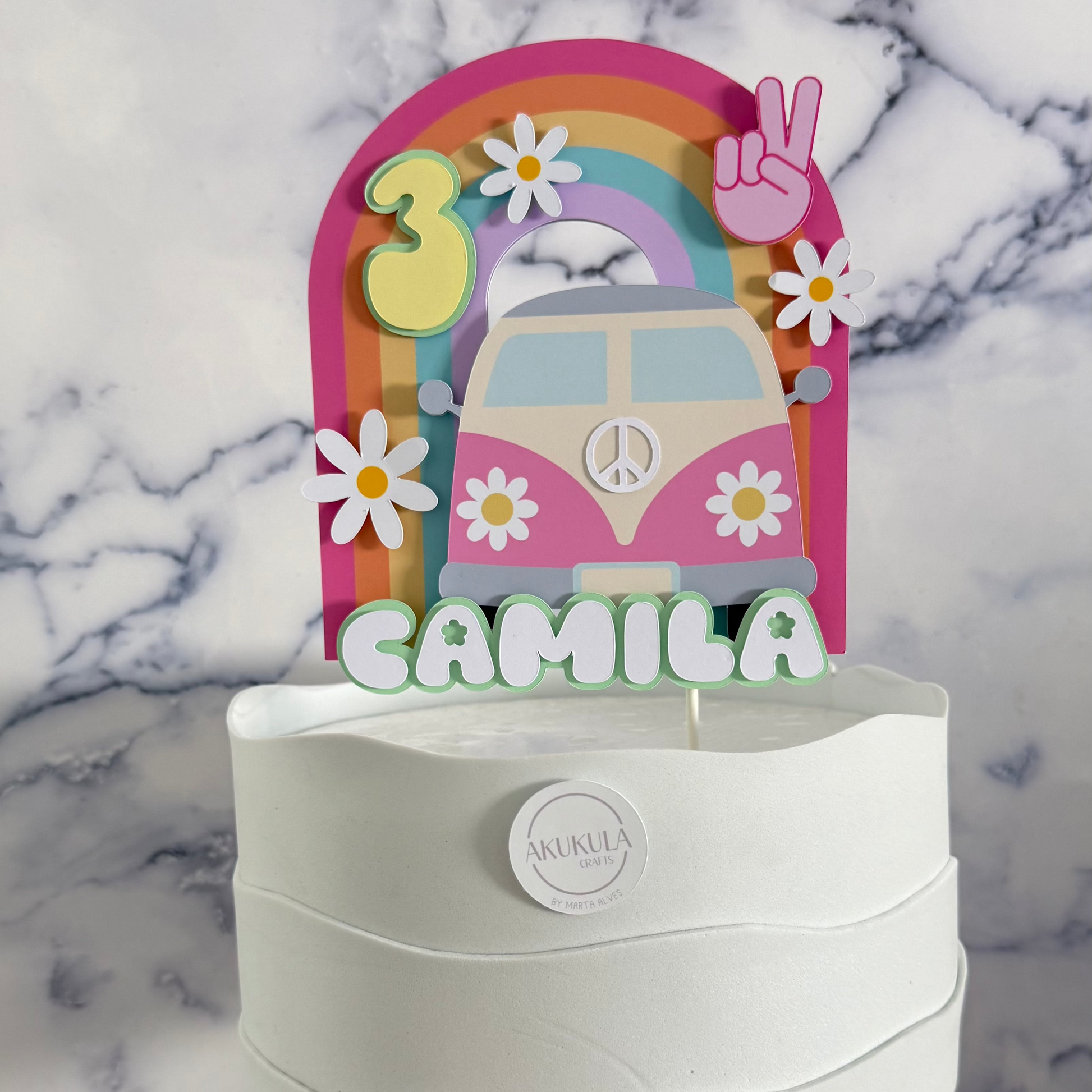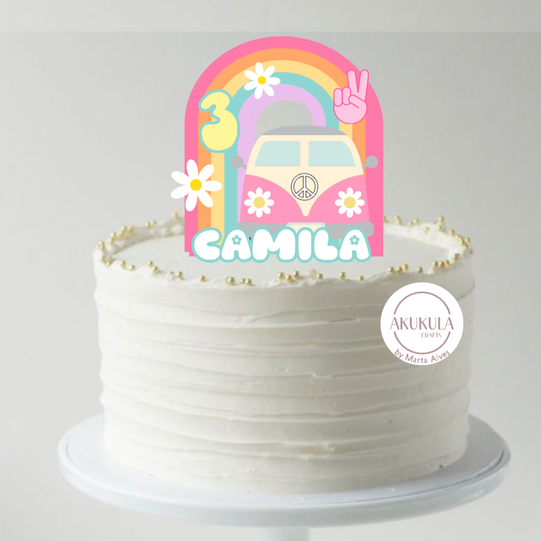 Celebra o aniversário com uma explosão de cor e boas vibrações! Este topo de bolo foi inspirado no espirito livre dos anos 70, com a carrinha vintage, arco-íris alegre, flores, perfeito para quem quer uma decoração divertida, original e cheia de personalidade.